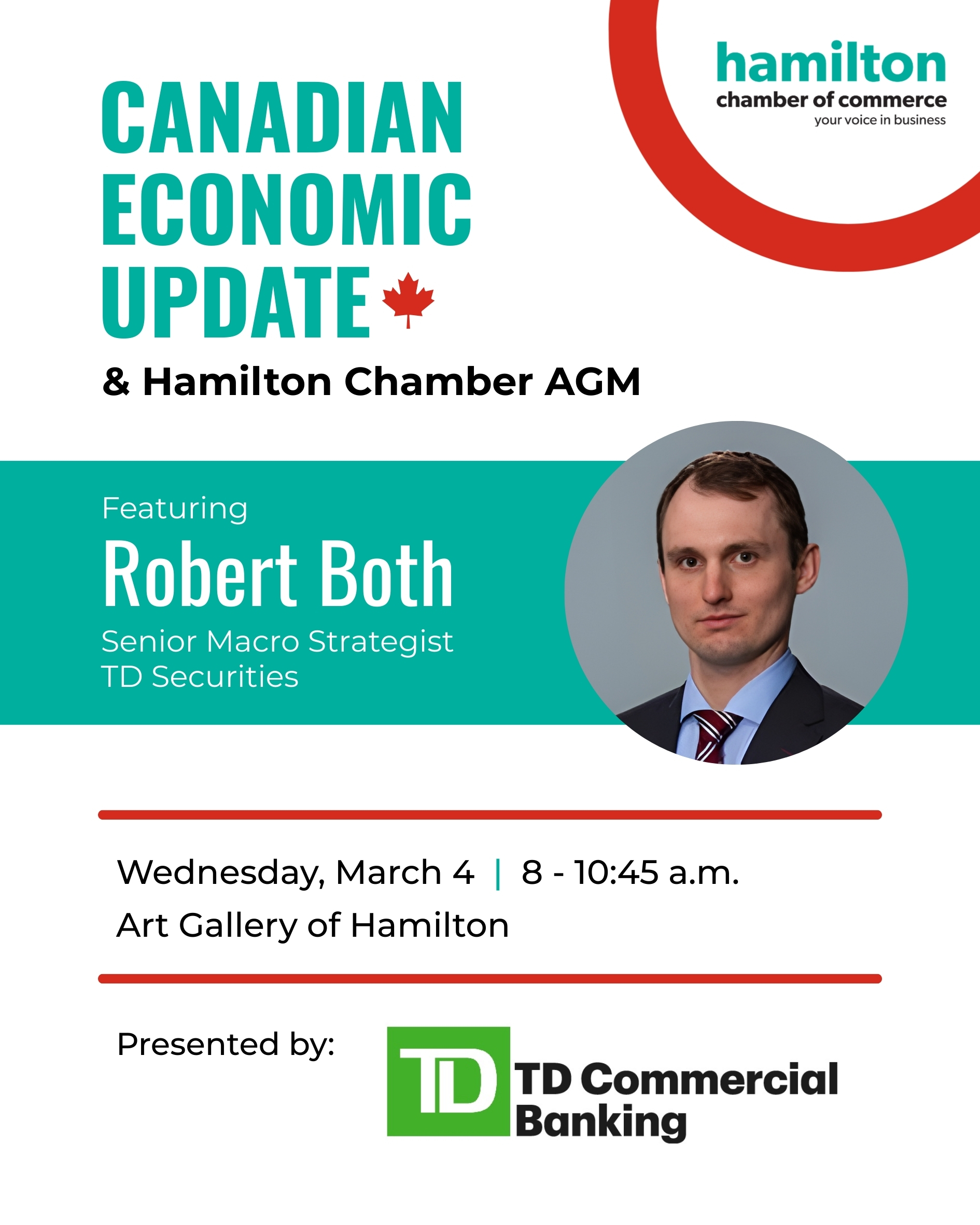 Join us on Wednesday, March 4 for a morning of insight, connection, and leadership at the Hamilton Chamber of Commerce 2025 Annual General Meeting, paired with a Canadian Economic Update, presented by TD Commercial Banking, at the Art Gallery of Hamilton.